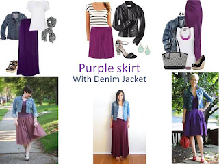 This looks great but is still a little dressier than I wanted, but it gave me an idea, so I now change the search to 'Purple Skirt Denim Jacket Outfit' and see what else comes up. I save a few pictures and then have something like this.